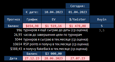 Из совсем недавнего, я добавил функцию предсказания баланса (на рисунке именно баланс, а не профит, хотя можно и профит просто посчитать, но мне это неинтересно). Либо на основе ev/chips, либо $/твистер, либо просто из аппроксимации (самый тупой способ) делается прогноз сколько hero заработает к той дате, которую он выбрал на предыдущем шаге, когда ставил цель. Тут же можно посмотреть сколько турниров hero в среднем сыграет до этой даты (на основе его предыдущей активности, учитывая его периоды неактивности), сколько рейкбека заработает, сколько часов это всё займёт.