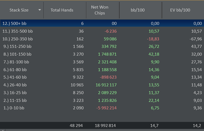 Уже 8 дней с начала марафона прошло, а я так ничего и не писал. Постараюсь делать отчеты регулярно, хотя бы раз в неделю. Первые 5 дней совсем не складывались, даже опустился до 150$ из стартовых 250$. Было много дипранов, но не складывалось. Не сказать что я как-то волновался по этому поводу, так как составы на аби2 просто невероятно слабые и рано или поздно диспа отдала бы. В итоге вчера так и получилось, вышло занести 8-макс турнир, на 310$. В итоге за 8 дней график выглядит вот так: Есть несоответствие между профитом и текущим БРом, так как я приравнял евро к доллару для простоты подсчетов. Винрейты по стэксайзам на текущий момент: Текущий БР 689$, буду переходить на аби 4. Встретимся на стриме!