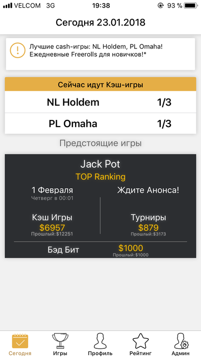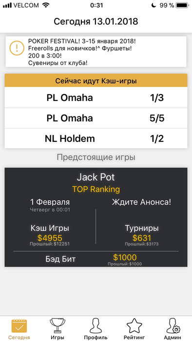 Друзья, 27 января (суббота) у нас состоится турнир 50$ NL Holdem Re-Entry/Addon. 28 января (воскресенье) турнир по Китайскому 50$ Pineapple 3-Max Re-Entry. Начало Турниров в 17:00! Ждём всех в гости!