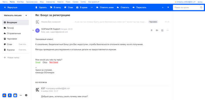 6) Я Написал в Поддержку с просьбой пересмотреть мой вопрос со сгоревшими билетами и сделать мне исключение ввиду того, что я много у них играю онлайн, являюсь очень лояльным игроком к Покер Руму и также играю их живые игры на серии. Плюс я выразил готовность сыграть эти турниры онлайн за билеты не через год, а в любой день начиная с сегодняшнего, так как живая серия все, закончилась. Я вспомнил про билеты (с опозданием в 1-2 дня кстати), когда проверял списания в кассе за внесенные БИ на покерной серии через онлайн аккаунт, да и вообще планировал уже продолжить игру онлайн.