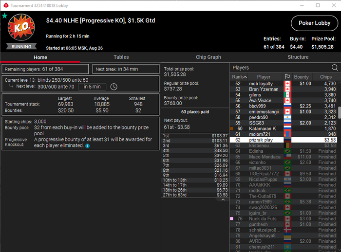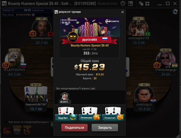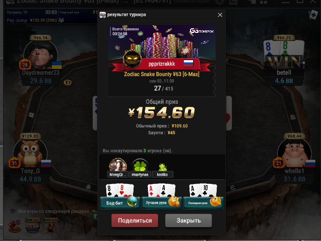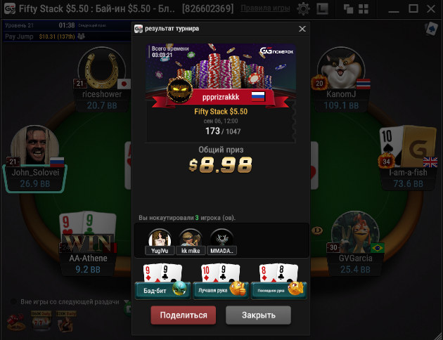 День 21. Решил катануть вечерочку и очень не зря) Было очень много крутых дипранов, но много повылетал на предфиналке .Также вкупы на старзах не пошли. Тем не менее один турик я все-таки разнес и результат супер отличный. Давно таких сессий не было. Сессия +960.47$. Бр 971.64$. В банке 194.32$