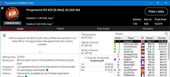 Этот турнир мог тащить и вывести месяц в гигантский плюс. Но нехватило моего знания ИСМ (дело не в последнем пуше даже, я до этого был со стеком в 2 ляма так-то)
