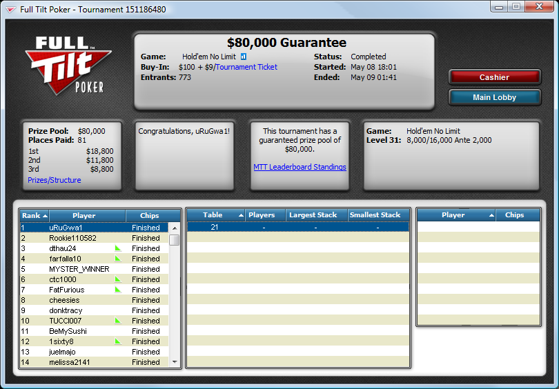 Начиная с ТОП-30 просто разрывал оппов в клочья, давно не помню таких слабых соперников в такой поздней стадии, на финалку вышел чиплидером, у второго было примерно в три раза меньше, почти всех повыбивал, ну и естесственно вышел в ХА с немцем , 9 мая все -таки, у меня было где-то 2 млн, у него 200к, он посопротивлялся, утроился, но в этот день я не мог проиграть Отдельное спасибо болельщику с ником Татьяна (точно не помню как) которая болела за меня всю позднюю стадию