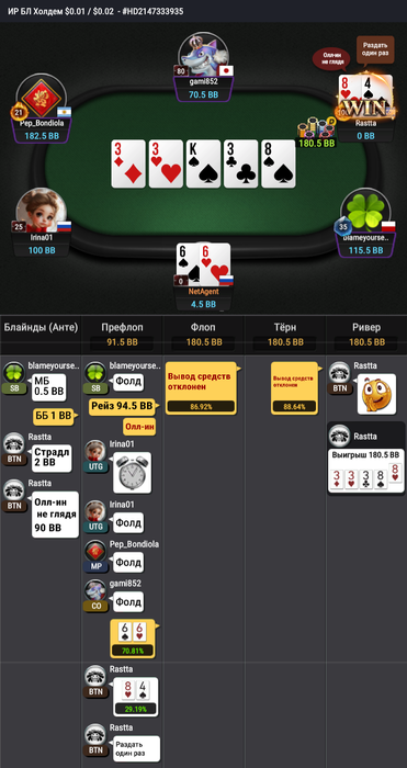 для примера попрошу обратить внимание - раздача против того же игрока (из первой раздачи)