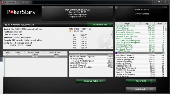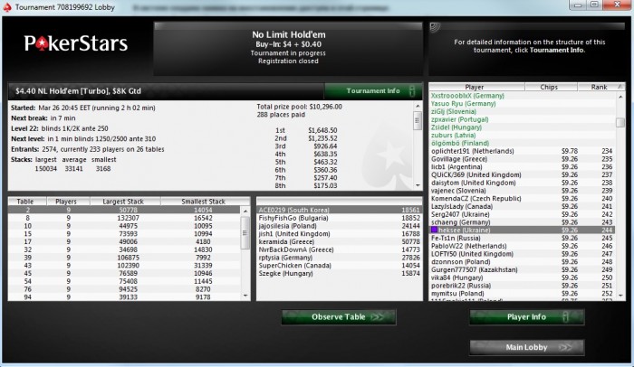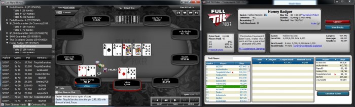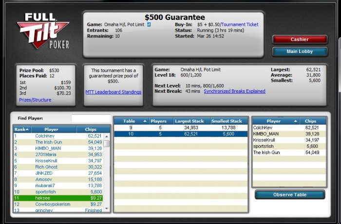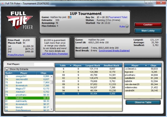 Full Tilt, 40/80 blinds No Limit Hold'em Tournament, 9 Players