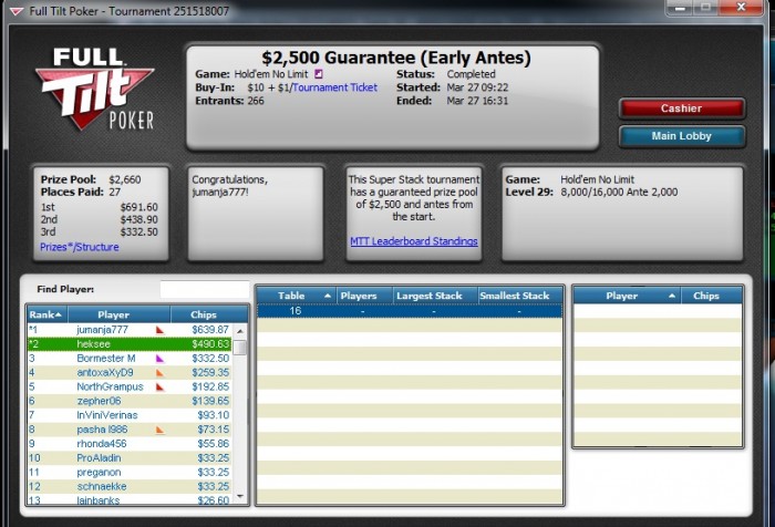 Full Tilt, 2,500/5,000 blinds, 600 ante No Limit Hold'em Tournament, 9 Players