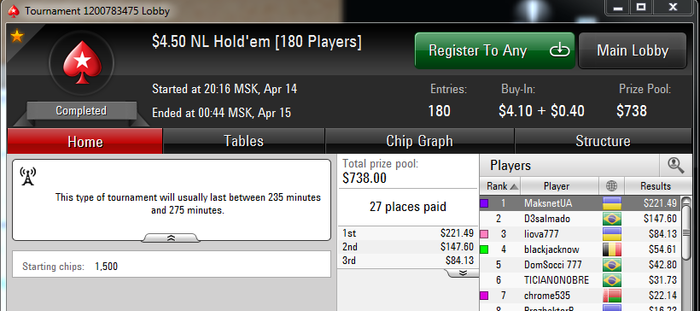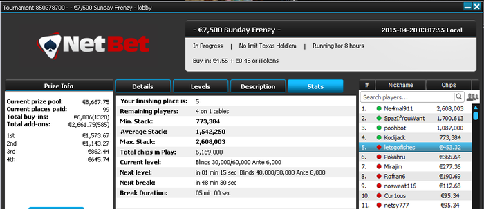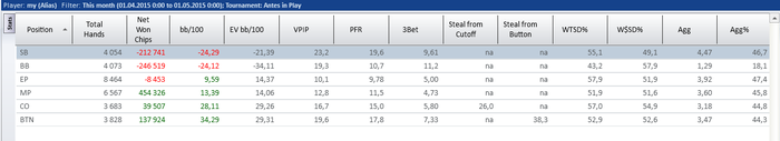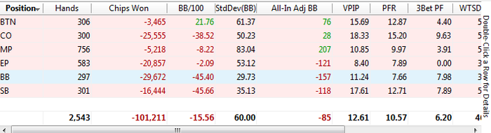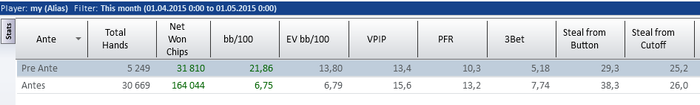 SB: 44.19 BB (VPIP: 26.09, PFR: 20.93, 3Bet Preflop: 8.33, Hands: 46)