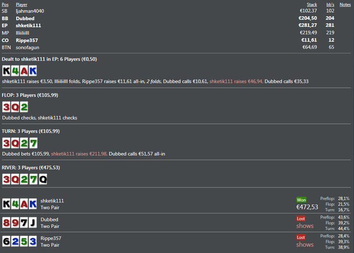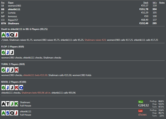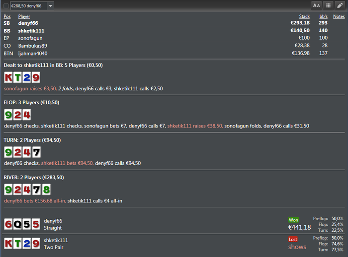 і знову ми на звязку ...))) з переходом на пло100 помилок в мене досить багато ,але радує тільки одне я збільшив свій процент 3-бету .. ) і в деяких ситуаціях мені вже набагато простіше ... .загалом хочу вийти на максмальну форму і до середини літа шотити пло200 ) плюс скоро Скупи думаю шось поіграти .. ) недорого ) а загалом про пло100 ліміт мені подобається ... я би неназвав його легким але тільтующих фішів або зальотних із казино досить багато .. але пічяль тіки одна основна ігра начинається в глибокі ночі ) буду старатись якось підстроїтись під цю лудокатку )) а сьогодні була найепічніша сесія на пло100 ) із плюсів пока в мене самий більший виграний банк цього року, із мінусів треба поставити собі стоплост я розумію що вікінги не здаються але треба щось з цим робити )) а загалом будем дивитись що з цього вийде в кінці місяця ) Всім гл гл гл ))