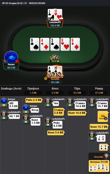 2 раздача огромная ошибка с моей стороны. Здесь у оппонент масса фуллов. И правильной игрой был фолд по риверу а рейзить только с фуллом, желательно сильнее К8.