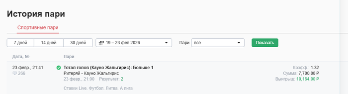 Вышка. Литва. Ретиряй - кауно , кауно инд тотал больше 1 1.32 , 7700 р