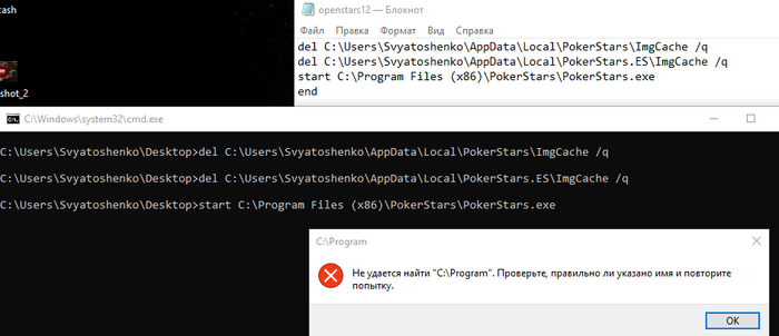 del C:\Users\%имя_компа%\AppData\Local\PokerStars\ImgCache /q del C:\Users\%имя_компа%\AppData\Local\PokerStars.ES\ImgCache /q start "" /D "C:\Program Files (x86)\PokerStars\" PokerStars.exe start "" /D "C:\Program Files (x86)\PokerStars.ES\" PokerStars.exe end