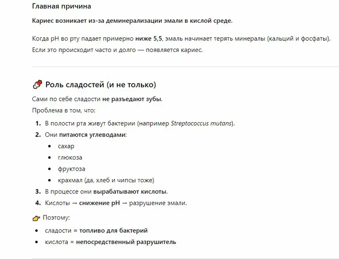 Сладкое - это не совсем причина, а один из факторов. Если конкретней - кариес вызывается изменением кислотности в полости рта. А кислотность меняется в результате деятельности бактерий. Бактерии эти питаются (следовательно размножаются) не только сахаром, но и углеводами. Поэтому - после употребления пищи/сладкого напитка - нужно как минимум прополоскать рот чистой водой, чтобы смыть остатки еды/напитков. Можно добавить жвачку без сахара, но тут уже гастроэнтерологи не все рады. В идеале - почистить зубы. Понятно, что это не сделаешь каждый раз. Но из того, что знаю я - прополоскать рот водой - чаще всего хороший вариант после любого приёма пищи. Мне это рассказывал стоматолог, но на всякий случай прикреплю чуть чата джпт: