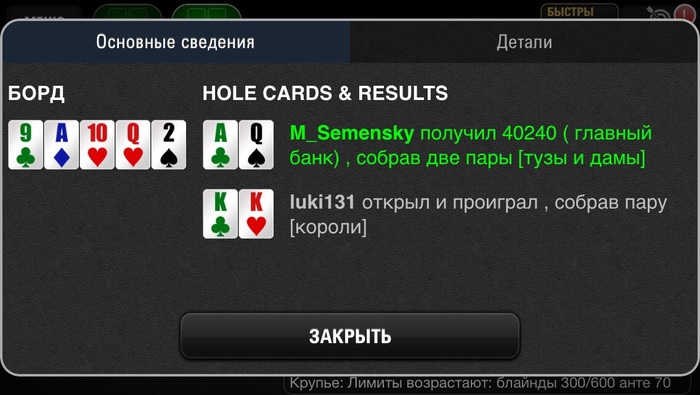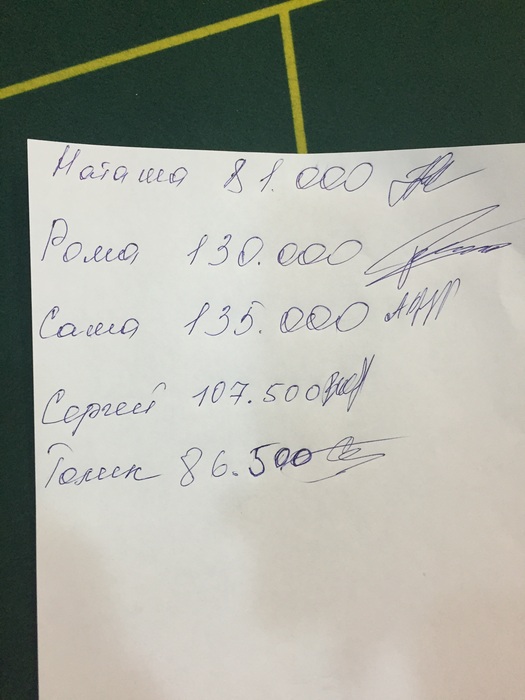 Рома:"Стек 135к ура, удвоение :))При блинах 1500/3000 это вполне рабочий стек.Там был оллин короткого, мы вдвоём закрыли и я с АК на флопе К хай вгрузил флоп спаренный тёрн прочекали и я ривер поддал, думаю, меня колировали на марьяже.Играем 7-Макс у меня 2ой стек по чипам."