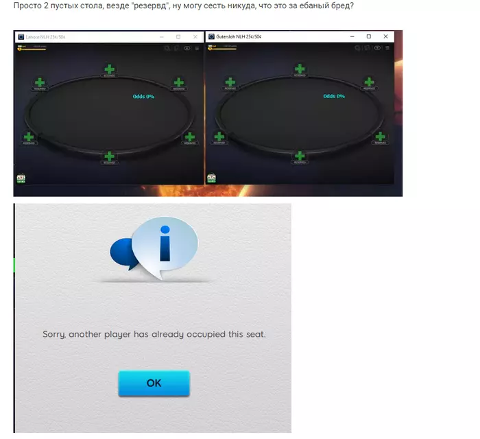 Раз тут такая тема, объясните, пожалуйста, рег столовому новичку один момент. Подключил нл50 888. То что открывать столы, где сидит 5 человек нет смысла я уже понял, никогда не сядешь. Но почему бывает часто, что пустой стол или там 2-3 человека и я никак не могу сесть, там все время висит резервд, просто бесконечный? Это не всегда за всеми столами, но супер частая ситуация.