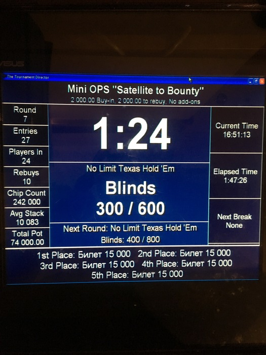 15:00 Turbo Satellite to BOUNTY в формате по 2 000 руб. Reentry Гарантия 30 000 (2 билета) _ стартовый стэк 6 000 _ стэк на Rebuy 8 000 _ поздняя регистрация 6 уровней _ Rebuy можно сделать в течении первых 6 уровней _ длительность уровней по 6*15/12 мин