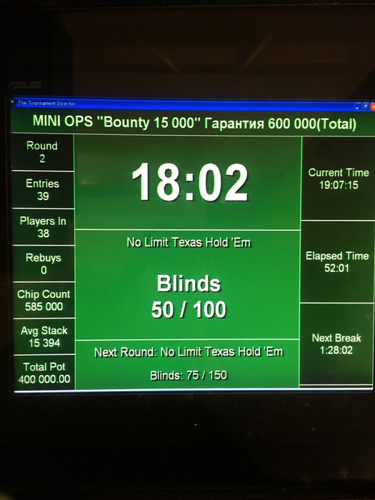 18:00 Турнир BOUNTY Re- Entry по 15 000 руб (bounty 5 000) Гарантия 600 000 руб (общая) _ стартовый стэк 15 000 _ стэк на Re-Entry 15 000 _ поздняя регистрация и период Re-Entry 8 уровней _ длительность уровней 8*35/ 30 мин