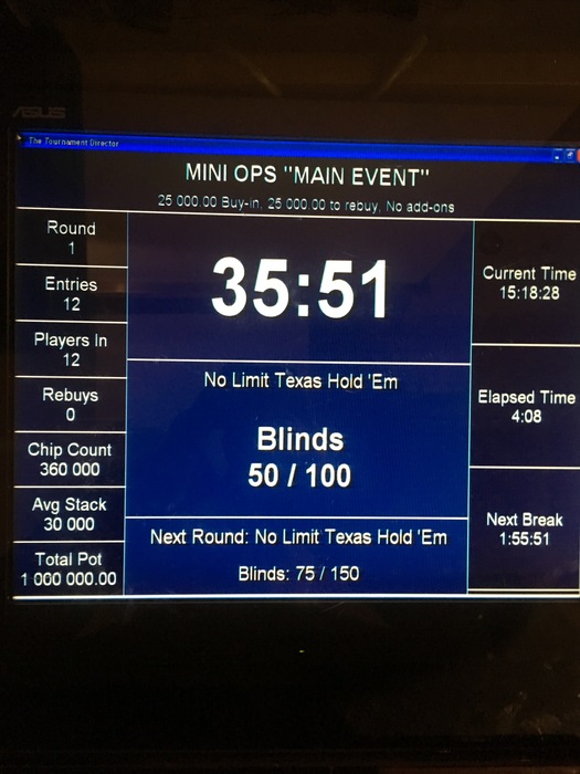 11:00 Turbo Satellite to Main Event в формате 1 Rebuy по 5 000 руб. Гарантия 75 000 (3 билета) _ стартовый стэк 6 000 _ стэк на Rebuy 8 000 _ поздняя регистрация 6 уровней _ Rebuy можно сделать тоько один раз в любой момент и на любое кол-во фишек в течении первых 6 уровней _ длительность уровней по 6*15/12 мин