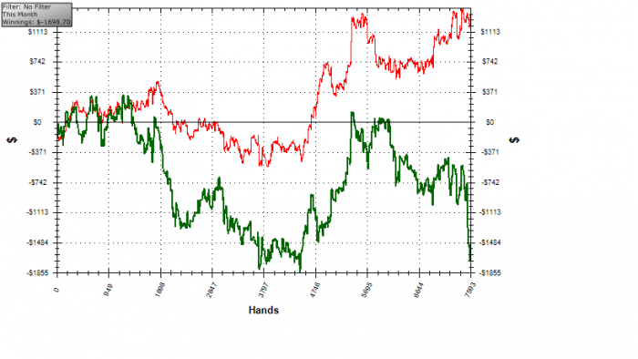 Еще всю ночь не спал, сегодня сыграл 12к рук за 2 сессии. В первой выйграл 5к, во второй проиграл 7к. Опять тильтовал много.