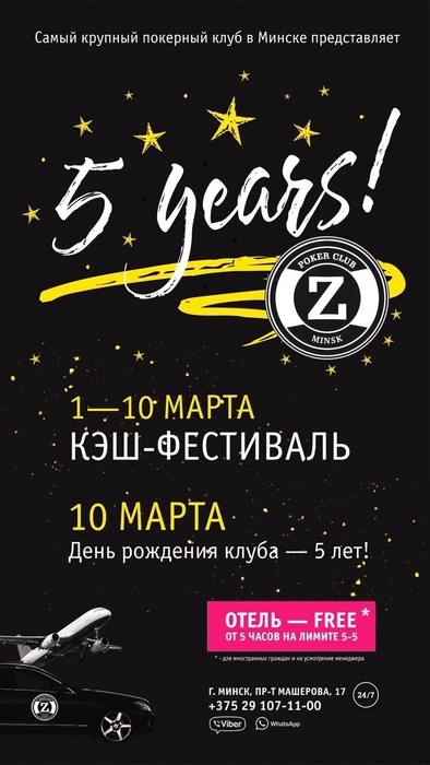 Три недели осталось до весны и старта очередного CASH FESTIVAL в нашем клубе! Этот фестиваль будет отмечен знаменательной датой, а именно День Рождения нашего клуба! 5 лет - это маленький юбилей! 5 лет мы стараемся создавать за игровыми столами атмосферу азарта и позитива, сочетающихся с профессиональным обслуживанием! Это первый, но непоследний наш юбилей!