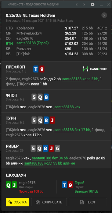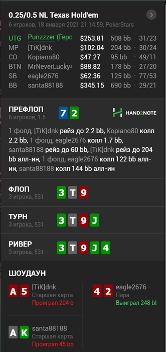 К моему приходу за стол у Санты и Тика уже было по 300бб. А всего с данным персонажем мне получилось сыграть 100 раздач за которые он показал феерические -900бб/100+++