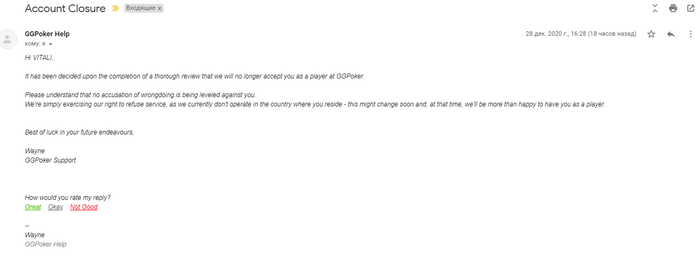 MaKAKaaka @ 31.12.2020 MaKAKaaka, Получил ответ о саппорта ggpoker,скриншот письма ниже: Перевод звучит приблизительно так: ________________________________________________________________________________________________________________________ ________________________________________________