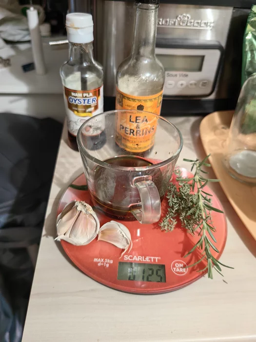 Обмазываем жижей из вустерского и устричного соуса, чеснока, тимьяна и розмарина.