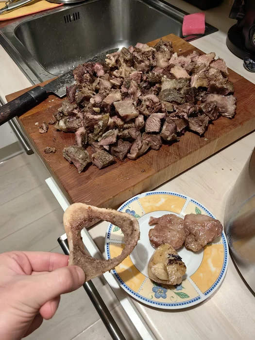 Всё вместе с костями было в пакетах при 17-часовом томлении, конечно. Потом их отделил и костный мозг подоставал — на хлебушек намазывать.