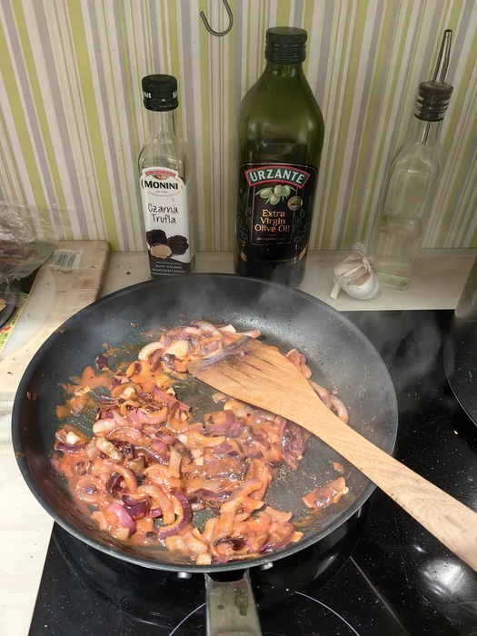 Жарим лук с томатной пастой.