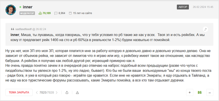PredvestnikUPstrika @ 29.03.25Возможно Иван и сделал вклад , систему которая привела какую то часть любителей в игру, но делал он это в корыстных целях имхо. Конечно ему выгодно что бы все месили рейк и деньги оставались в системе. То что он тут пишет какой вклад делает и борется за экологию лицемерие. Я бы даже не удивился что он приложил руку к взлому аккаунтов на покерок и сливу этих денег в казино с которого он явно получал ощутимую часть дохода.
