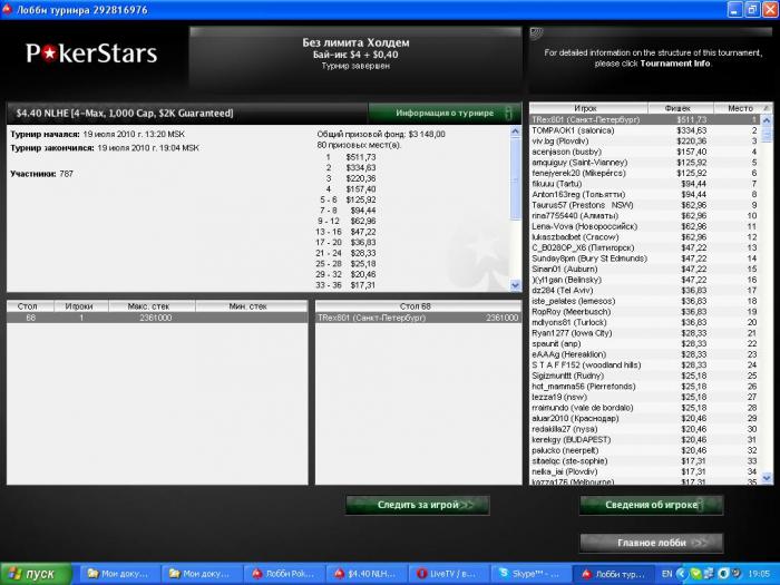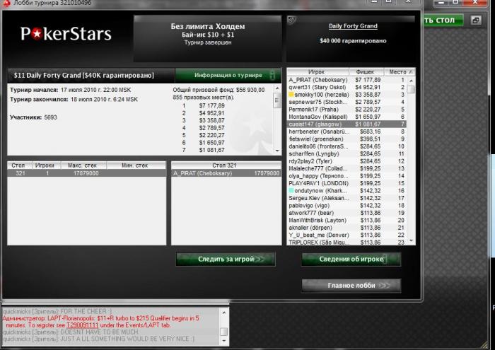 История такая - у меня с 888 не выводился категорически полтинник (по-видимому, это связано с полтосом от PS лохматой давности), поэтому, хоть и не собирался играть эти ужасные туры, но пришлось. Сыграл туры, проиграл, и вот в этот день играю последние 2 тура на последние деньги - один за 5.50, другой за 11 - (на счету остаётся 8 центов). Из 5-ок вылетел в середине, а вот в 11 зацепился. Игрой своей доволен, но игра без анте УЖОС! 97 тел из 106 участников вылетали 2ч.50мин., а финалку на 9-х мы играли 2 часа!!! Спасибо дисперсии, что именно на финалке вернула мне (долги, хотя возможно только я думаю, что она должна мне )- я должен был вылетать 5-м, но А 10>А К. Из-за того, что очень долго играли, средний стэк в игре 4- и 3-макс был 13 бб - очень тяжко! Но когда настроены терпеть, всё будет хорошо. Начиная с топ3 мой будущий опп по ХА начал играть в мегаагрофишстайл, что благотворно сказалось на моём стэке, и в ХА это закончилось для него плачевно, хотя был момент, когда перевес у него надо мной был 260к на 60к. Спасибо огромное victorsv72 и Mike_D, которые меня поддерживали на протяжении этих ужасных 2-х часов. Вместе мы победим!