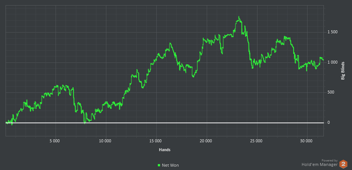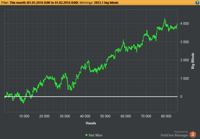 Первый месяц в этом году подошел к концу. Можно подвести какой-то итог. Этот месяц был реально самым крутым по количеству сыгранных рук. До этого был максимум что-то около 45К рук. И мне пока не надоело это дело, даже наоборот. Я вижу свои ошибки, вижу что надо исправить и постараюсь этим заняться. В последний день месяца катать не буду, разберу то, что накатал и с 1 февраля с новыми силами в бой.