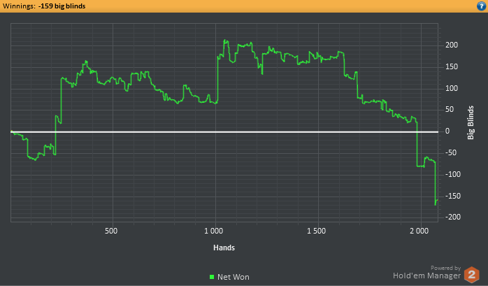 Разобрал банки сыгранные на стек (>4$). Если бы я сфолдил там, где это было изи ваще и не блефовал по тупому, то винрейт был бы уже в 2!!! раза больше. То есть я даже не смотрел еще средние и мелкие банки. Жесть.