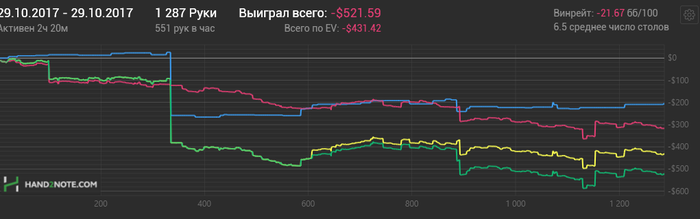 Дневник превращается в простой ежемесячный отчет, но меня это устраивает! Сентябрь-ворстманс по кол-ву сыгранных рук, скоро буду как ГалтАтлас по 10к катать, только у него 400++ а у меня 50-100 вот проблема Но и время было отвратненькое по кол-ву игры-иногда сидел тупо час за парой столов. Но в основном я конечно халтурю, + бытовухи полно было, расскажу далее. Какого-то месячного марафона потенциально тоже не видно, в этом месяце начнется ремонт-закупки,контроль... В серединке тяжело было, словил такую череду: Работать над игрой чуть-чуть удалось, в основном разобрал базу и раздачки, но вообще у меня кризис в этом-тупо не знаю, что делать. В придумывании новых линий не силен, тенденции вроде не меняются, и не подскажет никто, такой вот тупик. Короче лайтовый режим продолжается, при том что денег на весь ремонт может не хватить-парадокс!