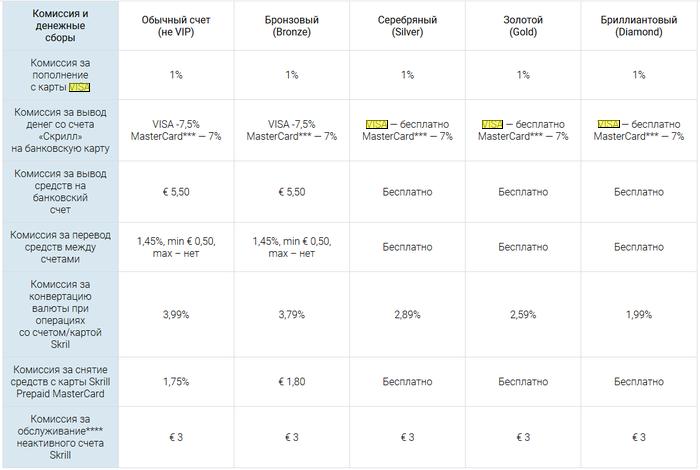 При выводе средств из Skrill на Вашу карту MasterCard комиссия за вывод будет составлять: - 7% (для всех статусов) Никаких дополнительных конвертационных сборов со стороны Skrill сниматься не будет, даже при условии, что валюты счёта и карты разные. На карту поступит сумма в эквиваленте по курсу банка-эмитента карты. Срок операции: 3-7 банковских дней. Лимит на снятие (в сутки): - $ 5000 (для всех статусов клиентов РФ); - $ 2500 (для всех статусов клиентов UA); - € 4900 (для всех статусов остальных клиентов). Чтобы вывести надо карту привязать в ЛК скрилл. 3) пока ,известных мне случаев, не было. 4) ЛС открыл.