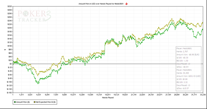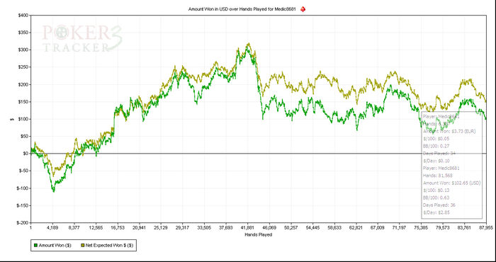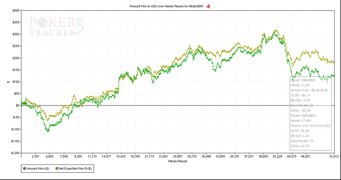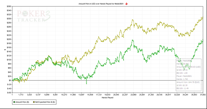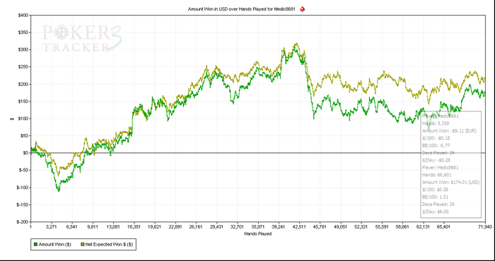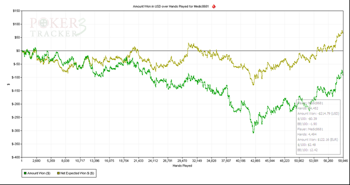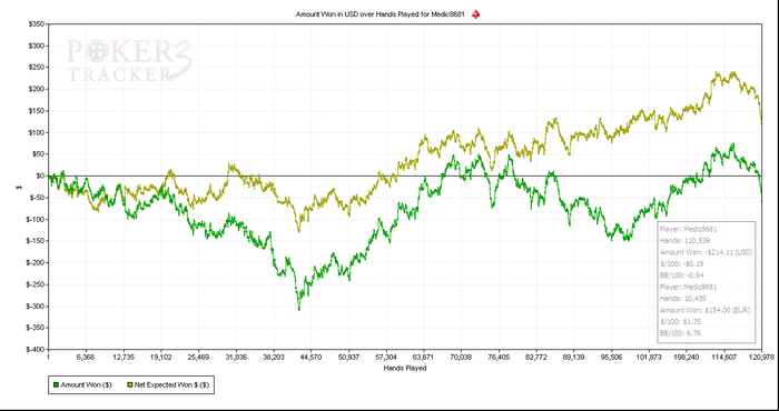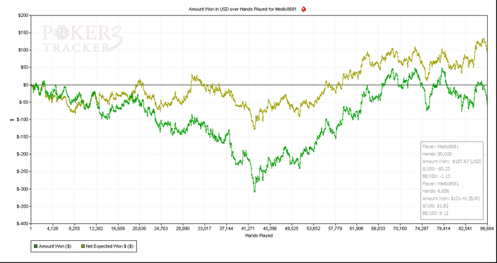 Получил 70би недобора на нл16-25 за 400к рук,спустился на нл10 переждать пургу и словил еще столько же би недобора за 500к рук,с последнего лимита график прилагается. Где-то я точно не перевел старушку через дорогу.