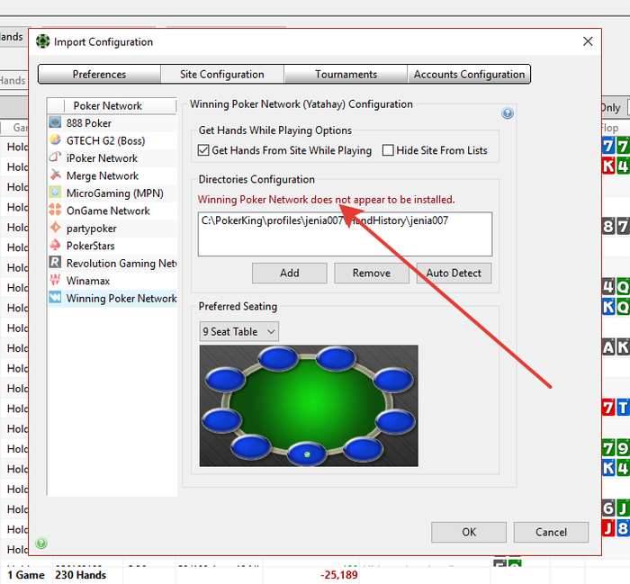 Ребят подскажите пожалуйста, не могу сам разобраться. Установил рум Pokerking (сеть Winning), но трекер не хочет видеть его. Рум хендхистори сохраняет, папку указал в трекере откуда импортить но в конфигурации импорта написано что данная сеть не установлена. Как это исправить?