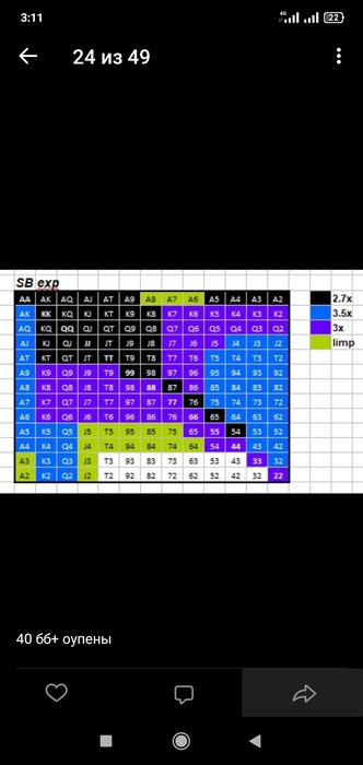 psdimas, Попробуй стать агрессивней с SB против BB в стеке 40 бб плюс .За исключением если на бб не сидит невменько который дефает с бб колом 80-90 процентов диапа .В действительности тебя не будут так часто трибетить как должны с ББ ,разве ,что колоть или фолдить .Тут оупены на скрине ,разными сайзингами с опр.диапазонами ,плюс добавляем лимп.Это повысит твой бб /100.Оппы будут перефолживать .Поставить тебя на конкретный диапазон будет оппам не возможно .Например одни рейзят только велью руки первых двух категорий ,а Бродвей лимпят - это все читаемо .