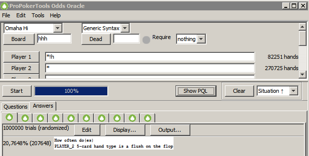 Дополнение. Если корректно заставить ппто просто посчитать комбы (он не умеет нормально считать, если поставить флоп общий, типа hhh. Нужно задать конкретные карты) , то он, конечно, показывает правильные комбинаторные числа, и, соотв, вероятность: