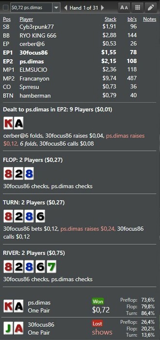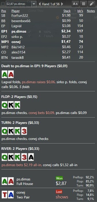 psdimas, Вопрос в другом. Имеет ли смысл колл префол с 77 без позы? Колл флопа в 3бет банке с третьей парой? На ривере он изображает даму или слоуплей флеша. Надеется выбить 9х, с которыми мы отколили флоп. (Хотя их там почти нет). А хер ему. Мы даже пару семерок не выбрасываем. Еще раз вывод нефиг блефовать на этих лимитах. Ты с Ах имеешь нормальное ШД.