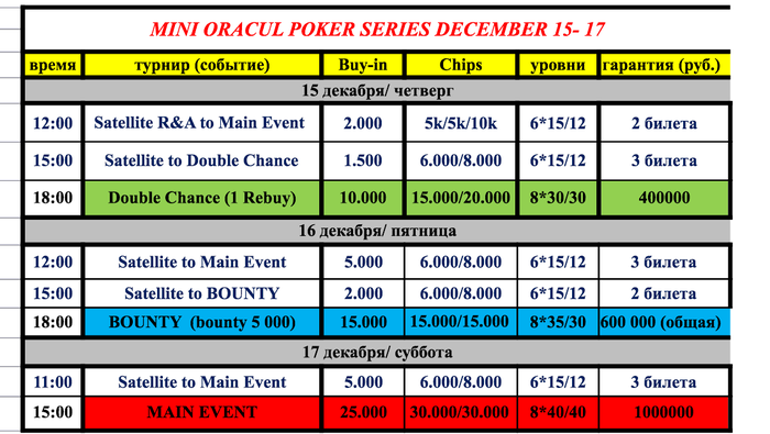Добрый день господа Итак сегодня первый день зимней мини серии в казино Оракул Только только закончилась регистрация в первом сателлите к Main В розыгрыше 2 билета по 25 000 и 20 000 руб полагается за третье место