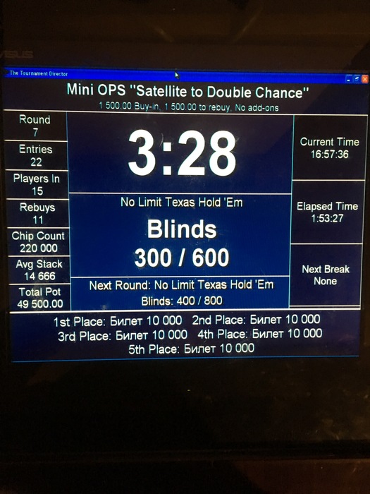 15:00 Turbo Satellite to Double Chance в формате ReEntry по 1 500 руб. Гарантия 30 000 (3 билета) _ стартовый стэк 6 000 _ стэк на Rebuy 8 000 _ поздняя регистрация 6 уровней _ Rebuy можно сделать в течении первых 6 уровней _ длительность уровней по 6*15/12 мин