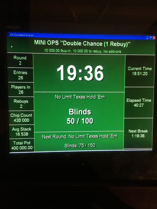18:00 Double Chance (1 Rebuy) по 10 000 руб Гарантия 400 000 руб. _ стартовый стэк 15 000 _ стэк на Rebuy 20 000 _ Rebuy можно сделать только один раз в течении первых 8- ми уровней, в любой момент и на любой стэк _ поздняя регистрация и Rebuy период 8 уровней _ длительность уровней по 30 мин