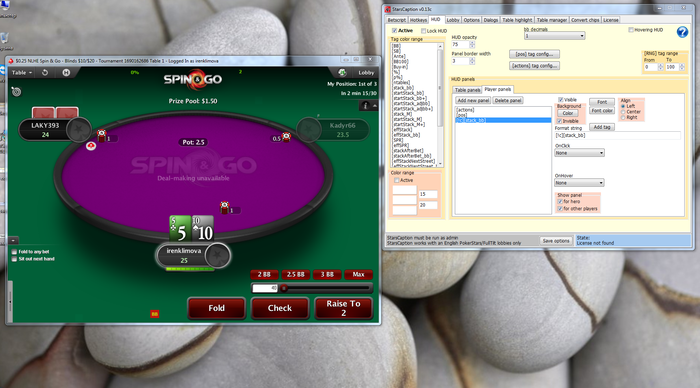 Привет, при попытке использовать HUD stackin bb возникла проблемка. Сам stackin bb работает исправно, но при добавлении тагов "hide on turney..." стеки в бб видны и на кэш столах и в турнирах, а при таге "hide on cash table" прячется и там и там...