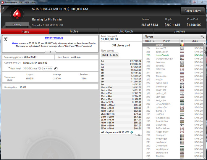 Poker Stars, $200 Buy-in (3,000/6,000 blinds, 600 ante) No Limit Hold'em Tournament, 9 Players