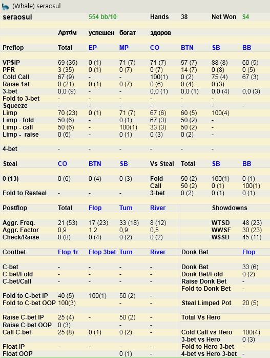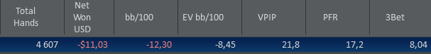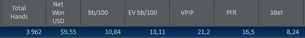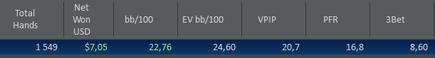 MP: $2.47 - VPIP: 22, PFR: 17, 3B: 11, AF: 0,8, Hands: 59