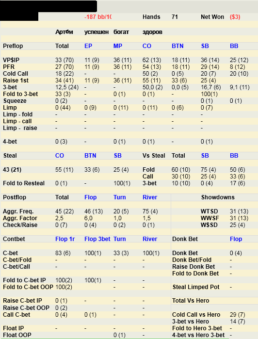 CO: $3.37 - VPIP: 34, PFR: 7, 3B: 2, AF: 1,6, Hands: 169
