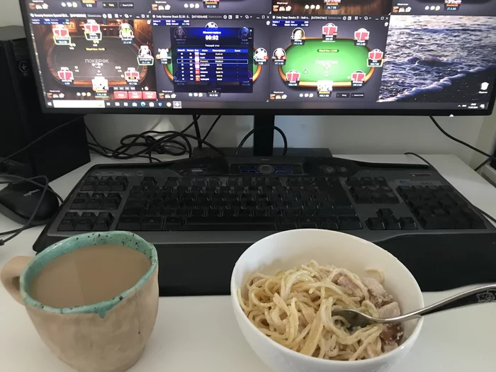 Женсчина кормит пастой и кофе без отрыва от процесса.