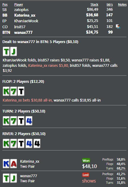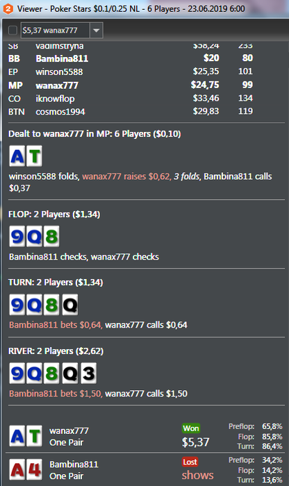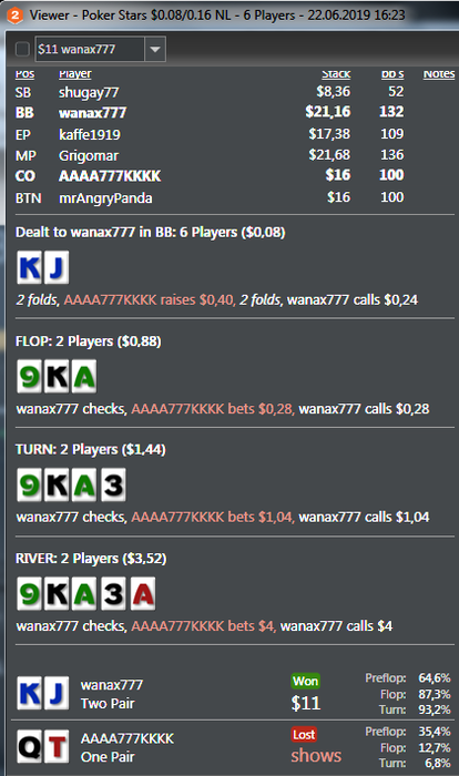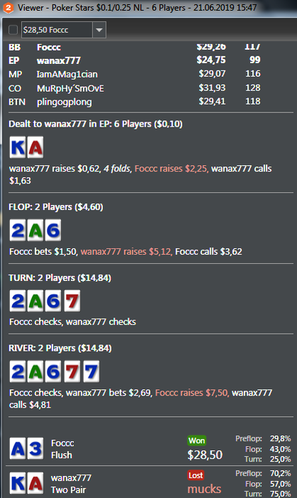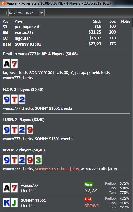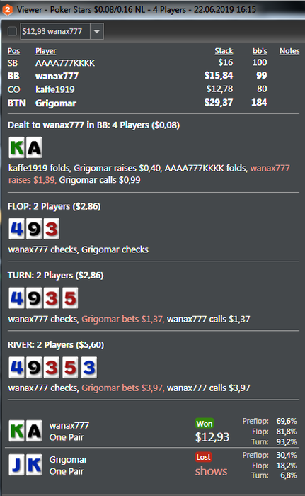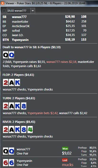 На мой рейз, он тут очень редко А-хай выкинет, хочу рейзить по такой доске не только на велью, но и с полу блефамии, ФД + 2бэкдр. Чек терн для баланса опять же с ФД и 2бкдр + ложная слабость хенда ( опп не фиш, чтобы я тут бездумно баррелил на велью ) на второй баррель он тут часто зароет многие свои А-хай слабее, иначе ему придется очень часто колить ещё и ривер (не забывайте, что он рег) и эти концепции он понимает. Кмк, ривер часто он тут может переагрить из за моей ложной слабости терна + у меня Кd блокер на флеш, поэтому кол. Что касается моих статов, я ЛАГ, с широким открытием и хорошей защитой своего ренджа.
