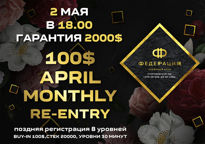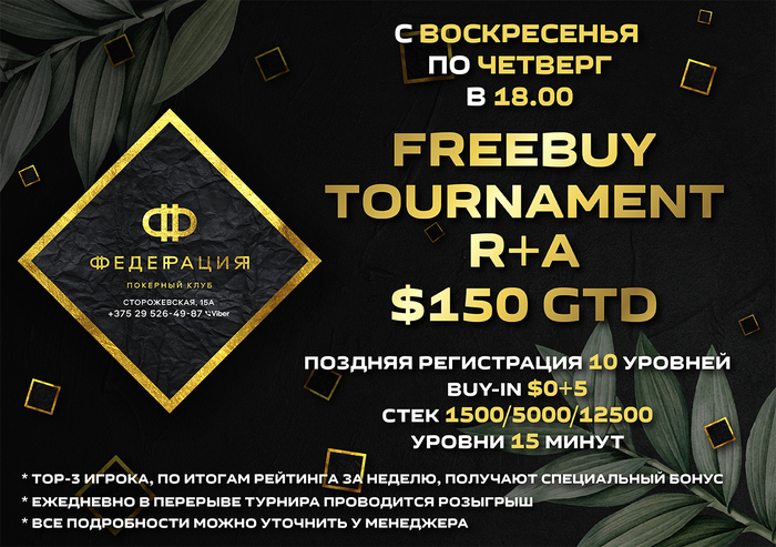 Дорогие друзья! Хотим вам предоставить новый формат турниров а так же несколько приятных бонусов. Каждый день с воскресенья по четверг, по завершению периода поздней регистрации мы будем разыгрывать 25$ среди участников турнира. Кроме того, каждую неделю, в пятницу, будет подводиться рейтинг участников турниров, победители которого получат 75$/50$/25$ за первое, второе и третье место соответственно. Все призы выдаются фишками для кеш игры. Данные фишки обязательно отыгрывать 2 часа на кэш-игре. Больше подробностей об акции у менеджеров покерного клуба "Федерация".