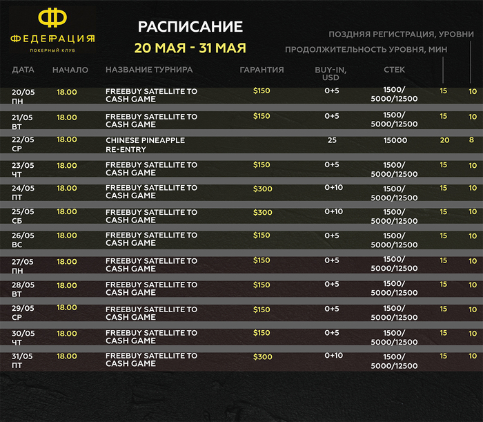 В среду 22 мая в 18.00 состоится турнир по китайскому покеру CHINESE PINEAPPLE Re-entry Бай-ин $25 Стек 15000 Уровни 20 минут Поздняя регистрация 8 уровней